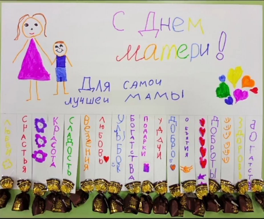День матери – замечательный и трогательный праздник, который ежегодно отмечается в последнее воскресенье ноября. Мама - самый главный человек в нашей жизни, окружает нас добротой, нежностью и заботой. Ребята с большим удовольствием поздравляли своих мам: приглашали их на театральную постановку, пекли совместно с мамами печенье, делали стенгазету про маму, изготавливали милые открытки, снимались в видеороликах!
