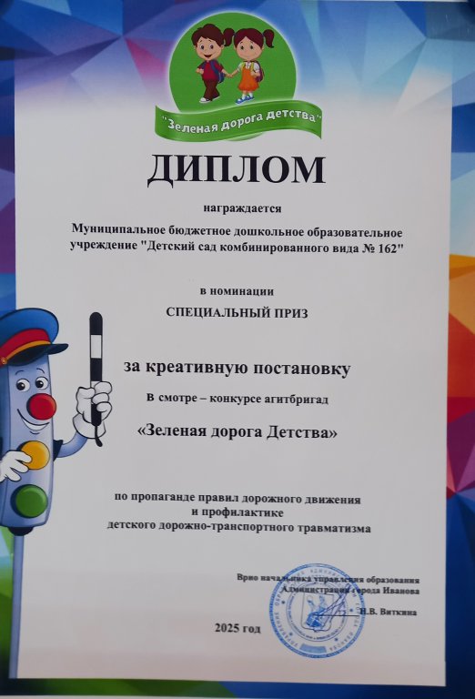 В смотре-конкурсе агитбригад"Зелёная дорога Детства" ребята гр. Буратино были награждены дипломом и памятными подарками за креативную постановку. Поздравляем!!! Так держать!!! Конкурс проходил среди дошкольников города, каждый детский сад представил свою детскую агитбригаду. Тема конкурса: «Использование отражателей и фликеров в тёмное время суток. Светлячки на дороге». Всего в конкурсе участвовали 48 детских агитбригад.